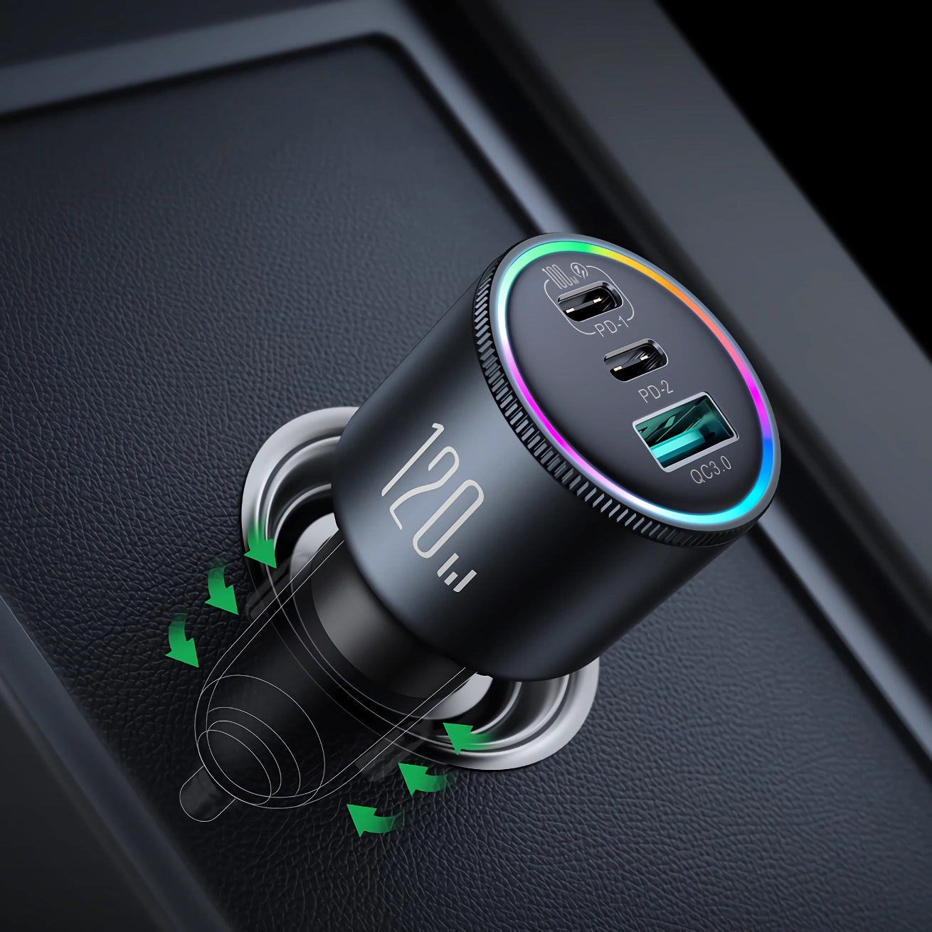 120W USB-C Car Charger – 3-Port Fast Charging for Multiple Devices (PD & QC 3.0)