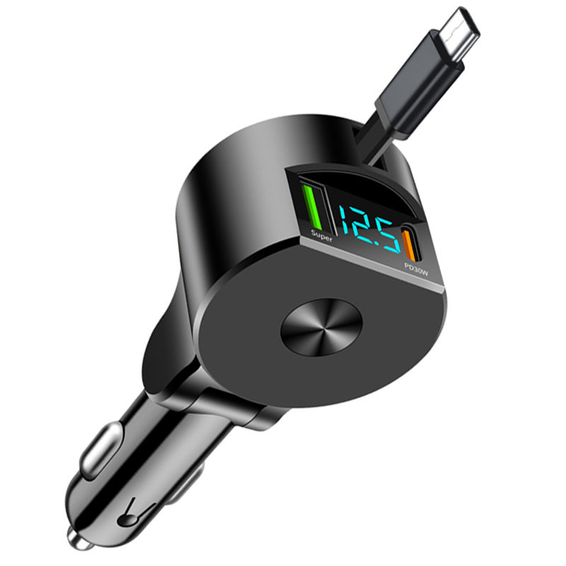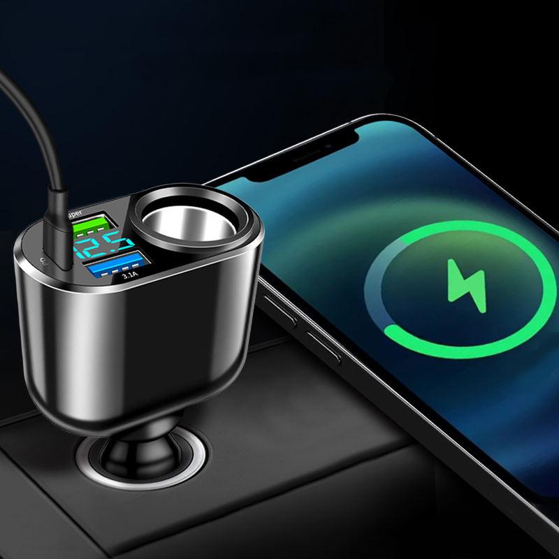 High-Speed 4-in-1 Retractable Car Charger with Dual USB, Type-C & Lightning Cables
