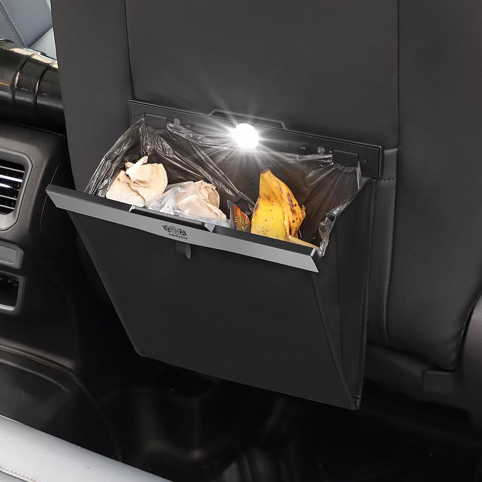 LED-Lit Magnetic Car Trash Bin with Waterproof Leather Storage
