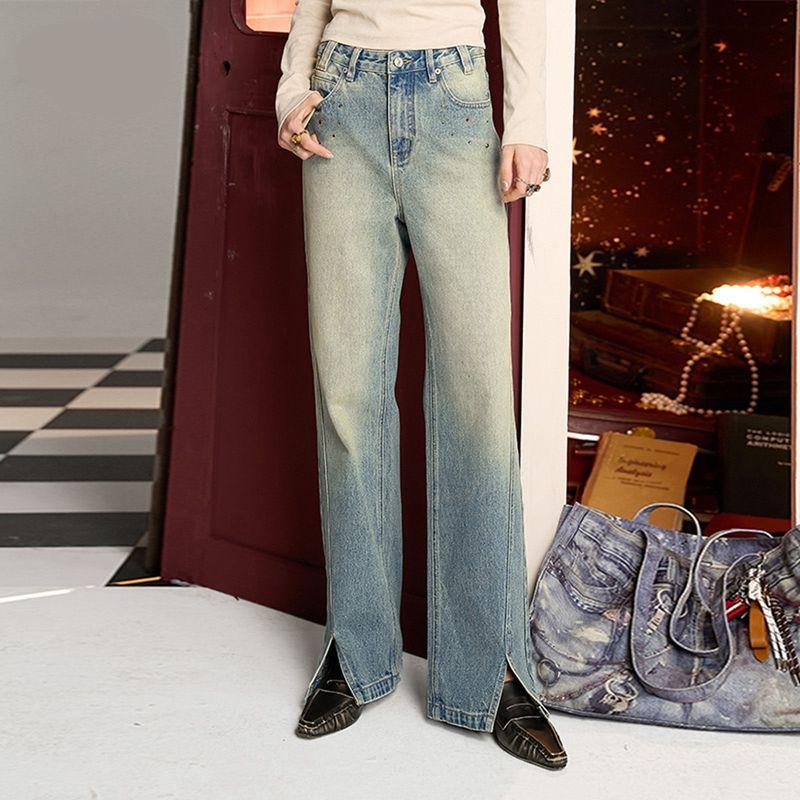 Washed Blue Retro Casual Color Diamond Split Straight Jeans for Women