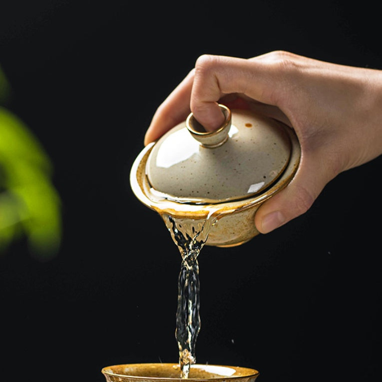 Elegant Rough Pottery Covered Bowl Gold Painting Kungfu Tea Set