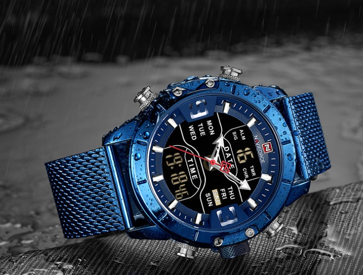 Men'S Watch Dual Movement Backlight Alarm Clock Waterproof Steel Band Watch Alloy Electronic Watch