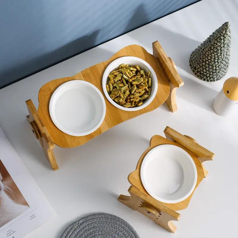 Elevated Ceramic Pet Bowl with Wooden Stand - Double Raised Cat & Dog Food and Water Feeder