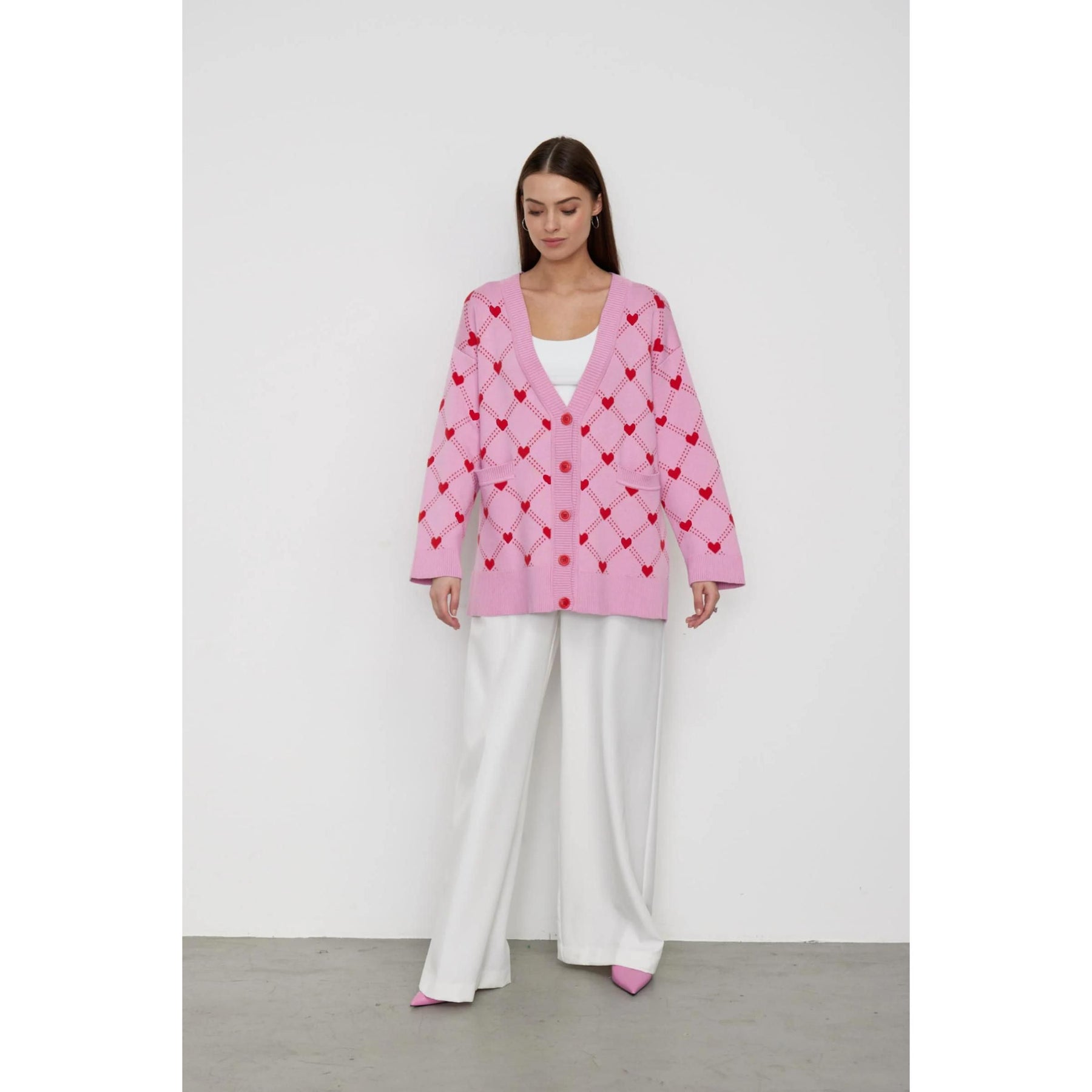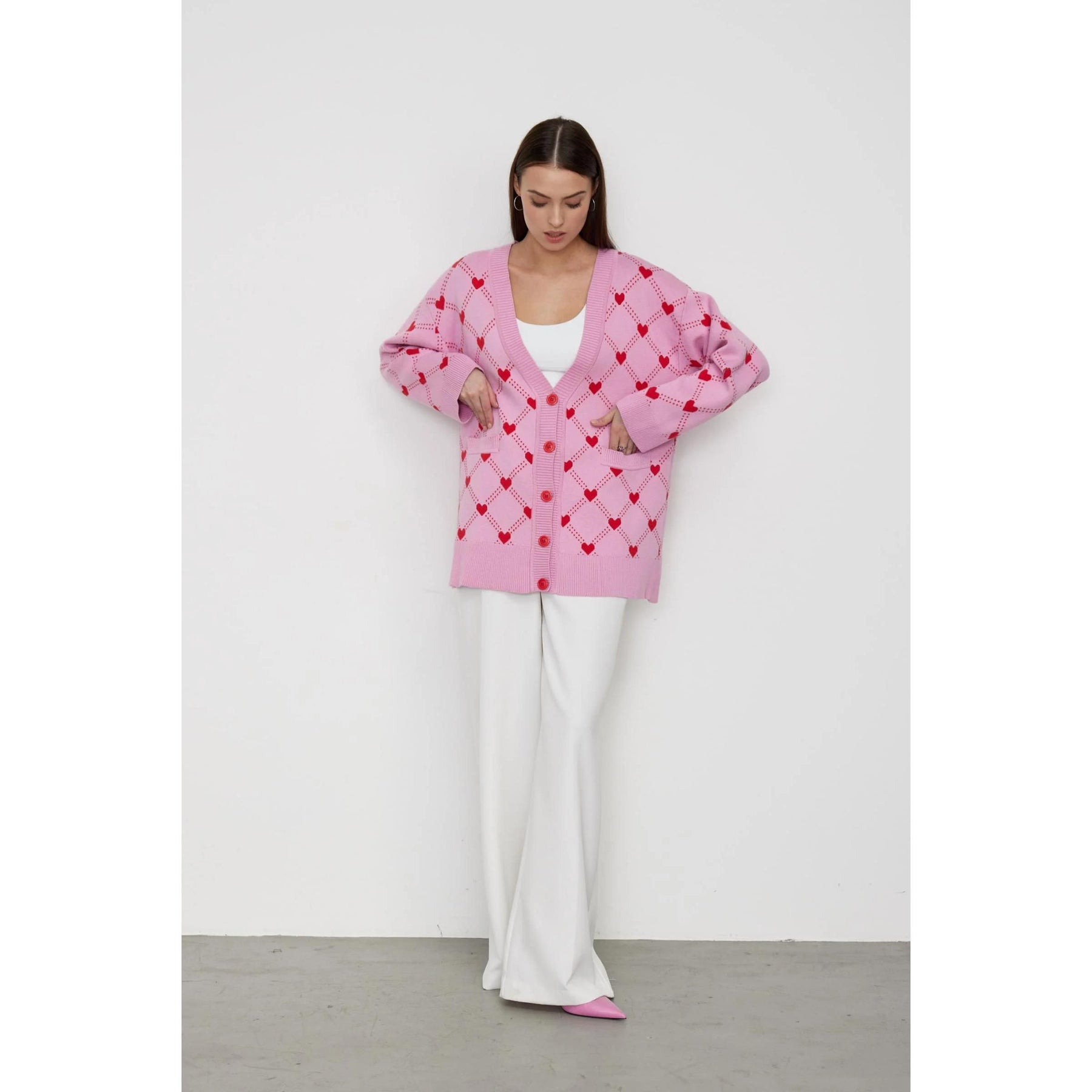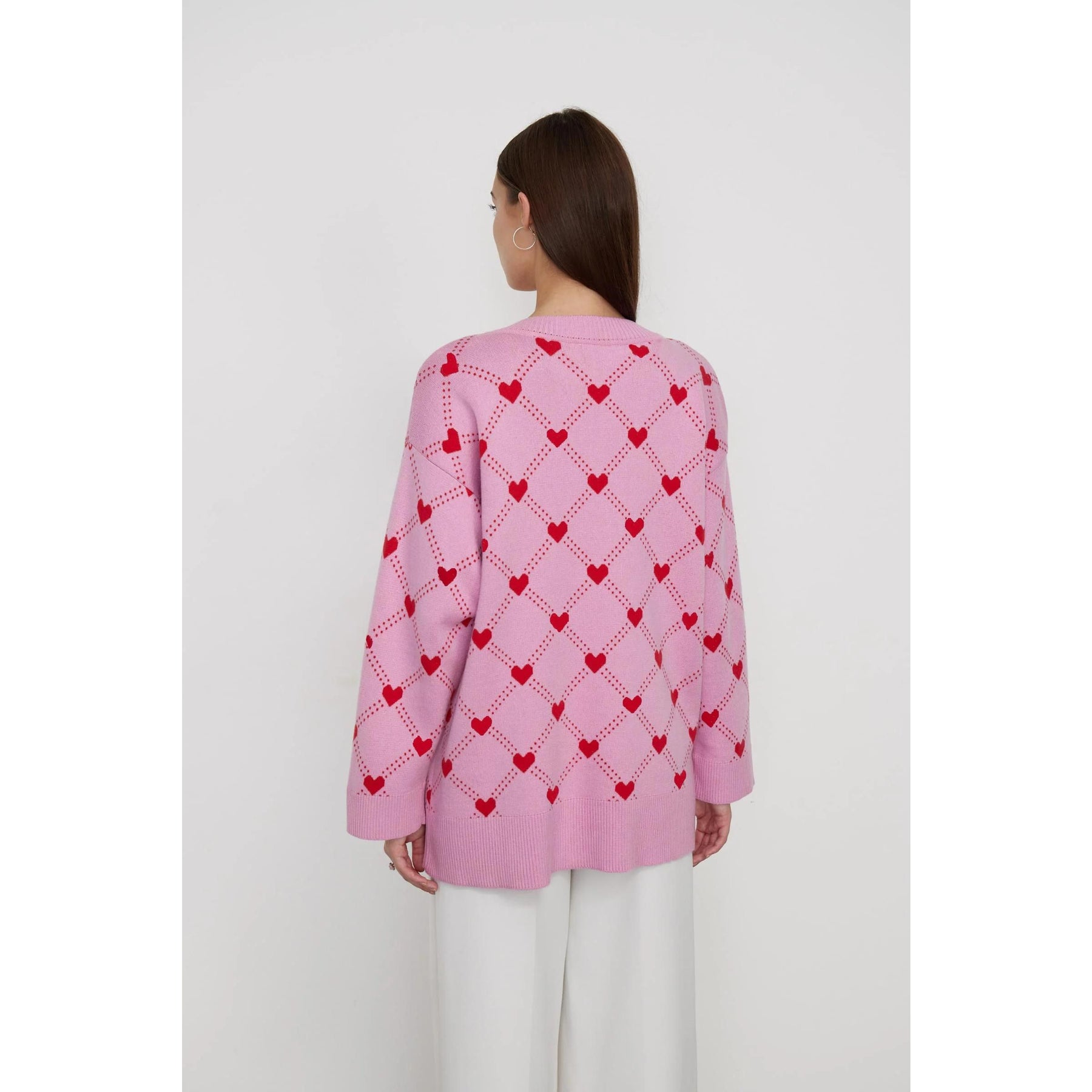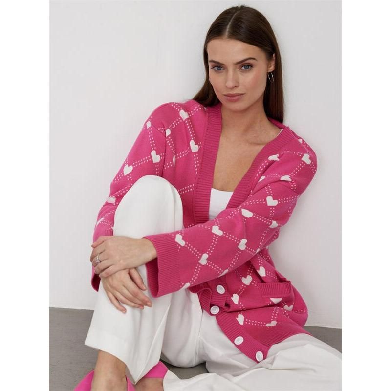 Women's Oversized V-Neck Knitted Cardigan with Heart Print
