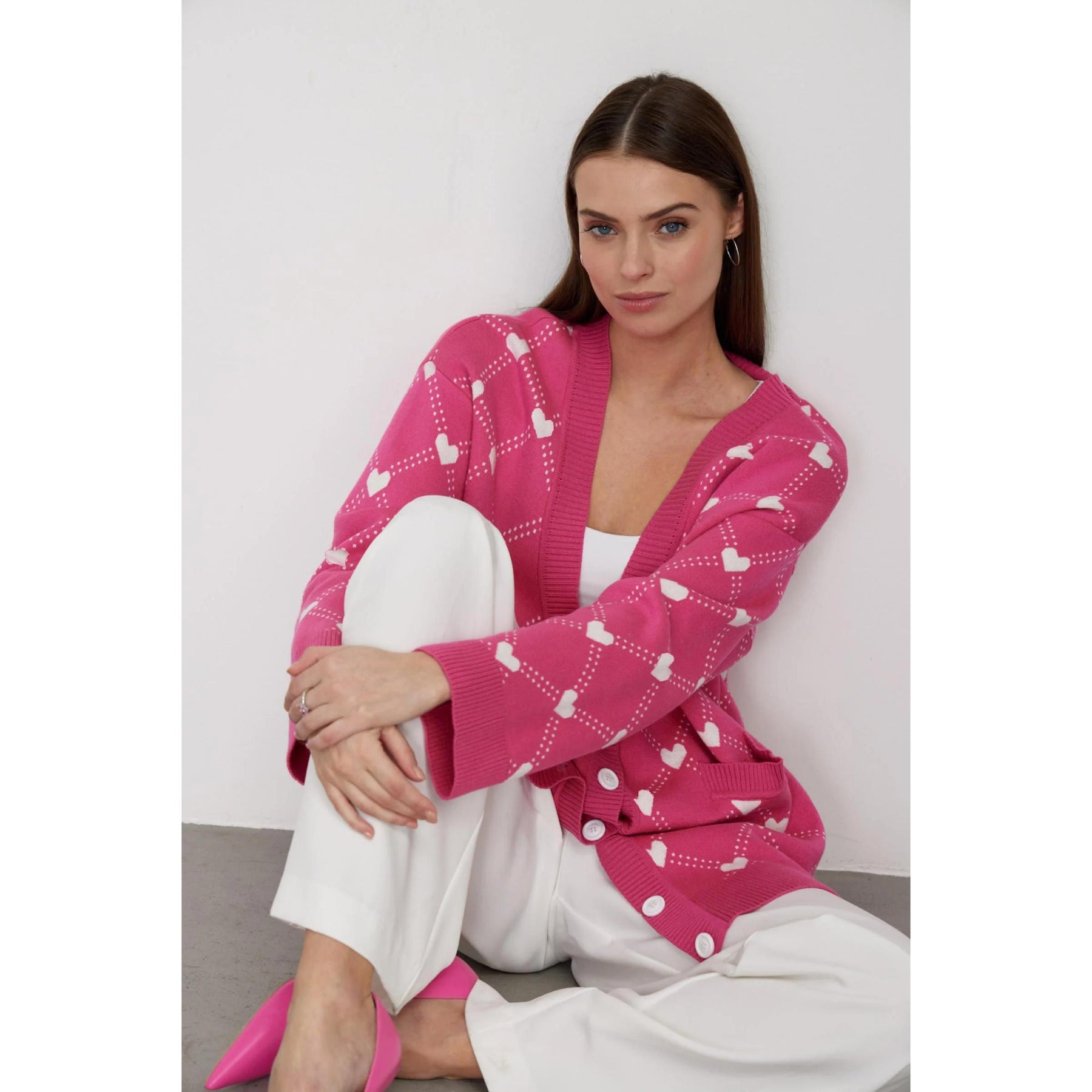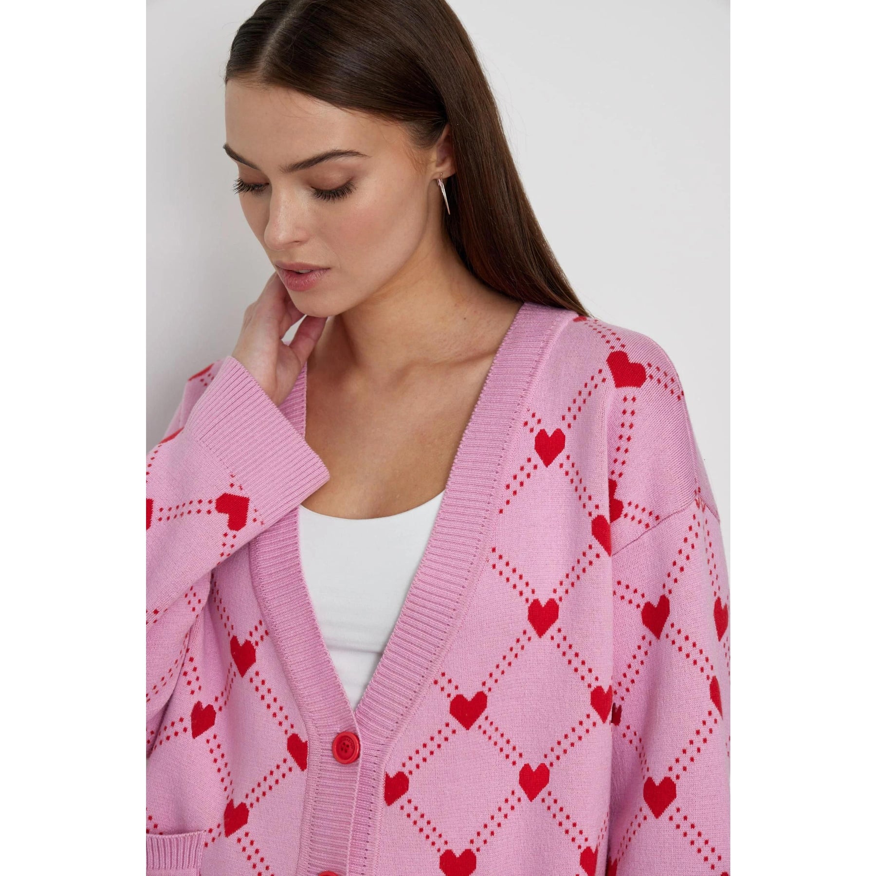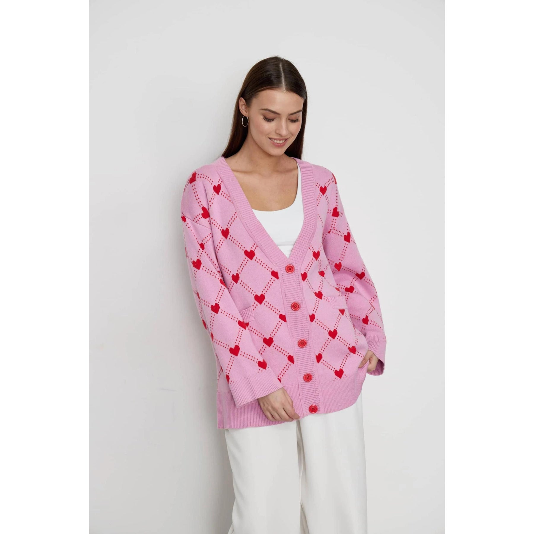 Women's Oversized V-Neck Knitted Cardigan with Heart Print