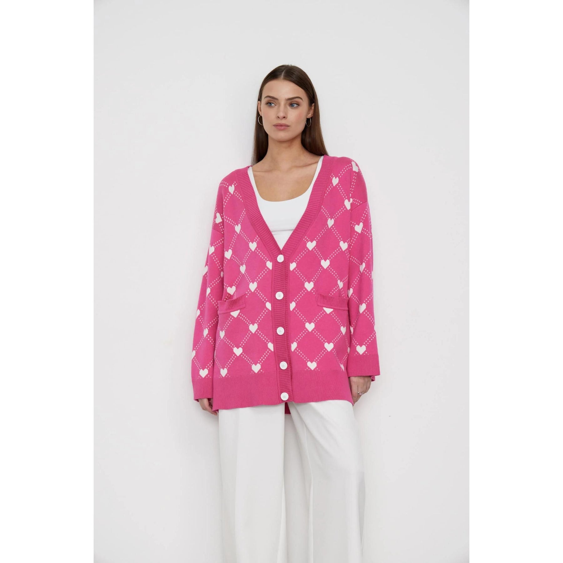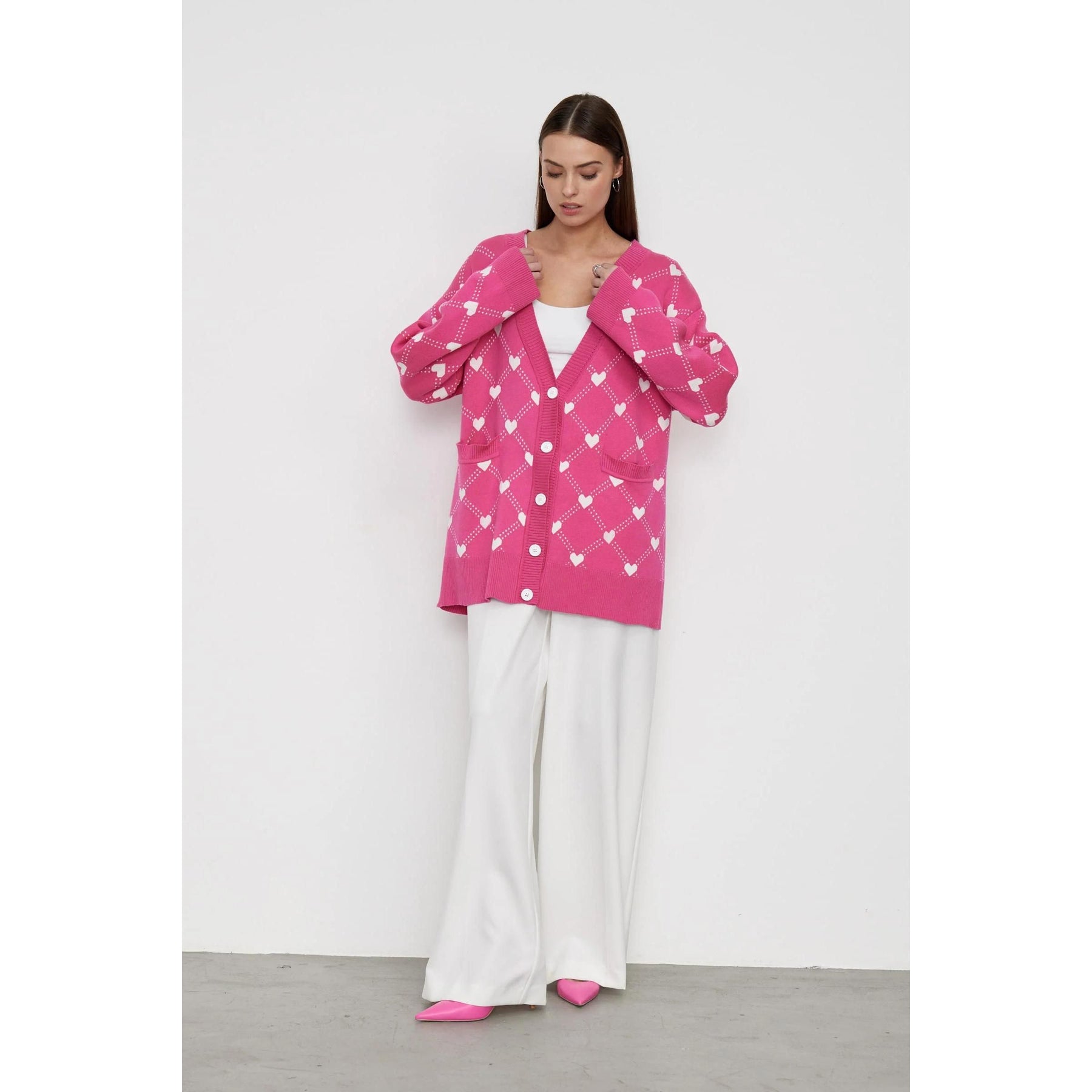 Embrace the cooler months in style with our Women's Oversized V-Neck Knitted Cardigan, a perfect blend of comfort and chic fashion. The delightful heart print design sets this cardigan apart, making it a unique and eye-catching addition to your wardrobe. Ideal for autumn and winter, this piece keeps you warm while ensuring you look effortlessly stylish.