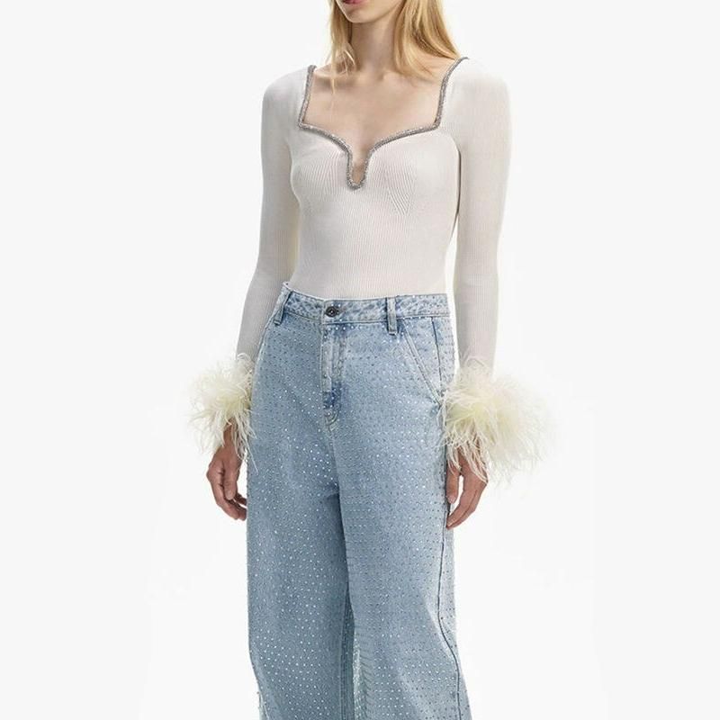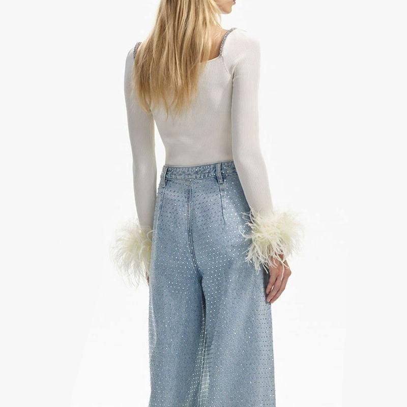 Our sweater boasts a unique feather patchwork design on the sleeves, adding a touch of sophistication to the classic round neck and slim fit silhouette. Made with high-quality polyester, it offers both warmth and durability. Its full puff sleeves and square collar design elevate the overall look, making it a standout piece.