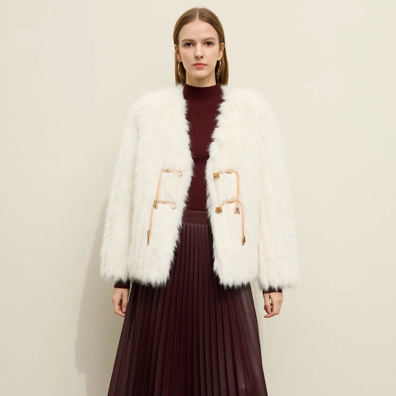 Elegant Loose Fur V-neck Coat with Leather Buckle