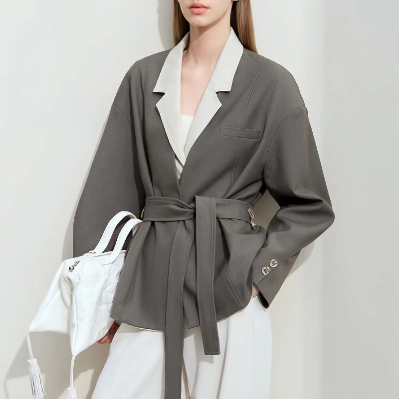 Elegant V-Neck Blazer with Belt and Shoulder Pads