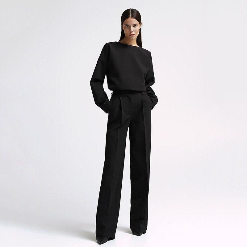 Elegant Two-Piece Office Suit with Long Sleeve Top and Wide-Leg Pants