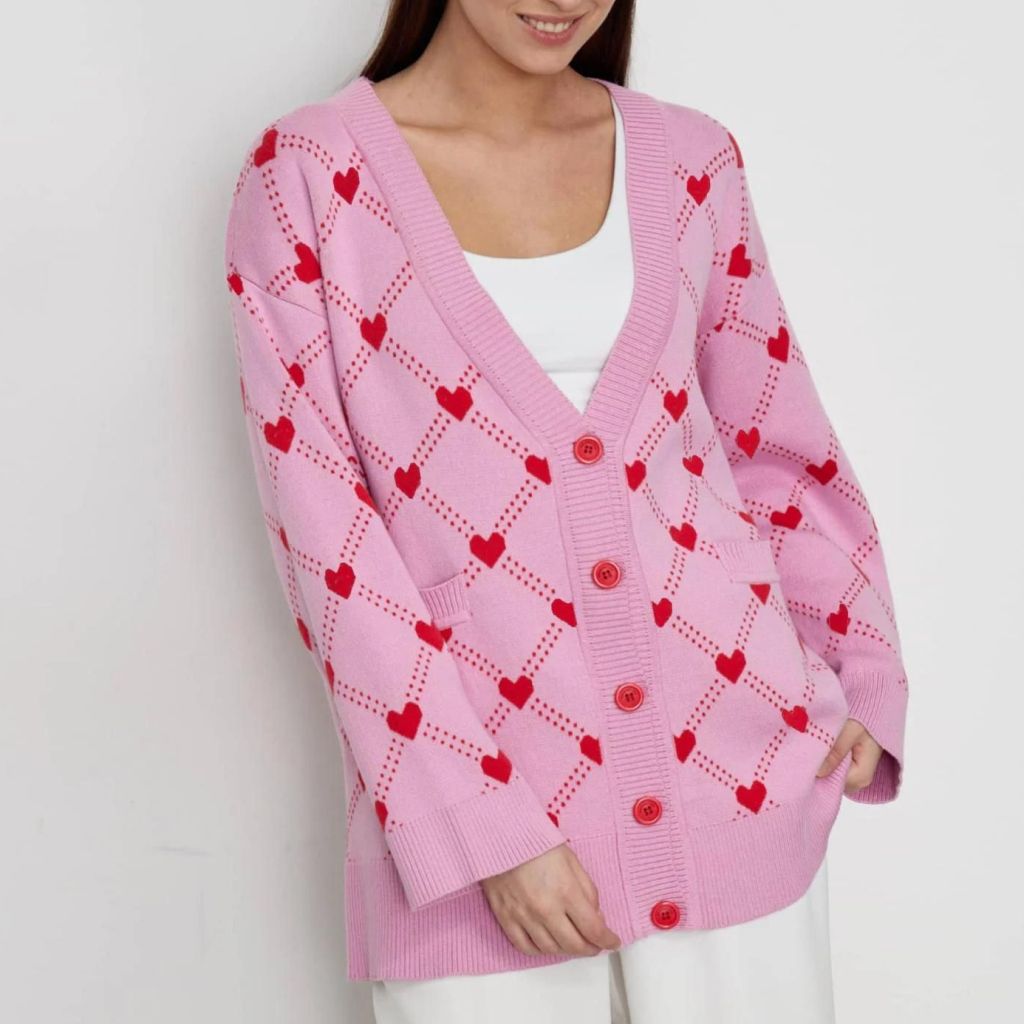 Women's Oversized V-Neck Knitted Cardigan with Heart Print