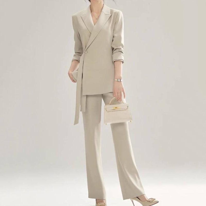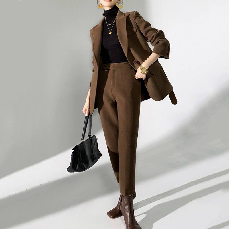 Autumn Winter Elegant Woolen Pant Suits with Belted Jackets and Warm Trousers for Women