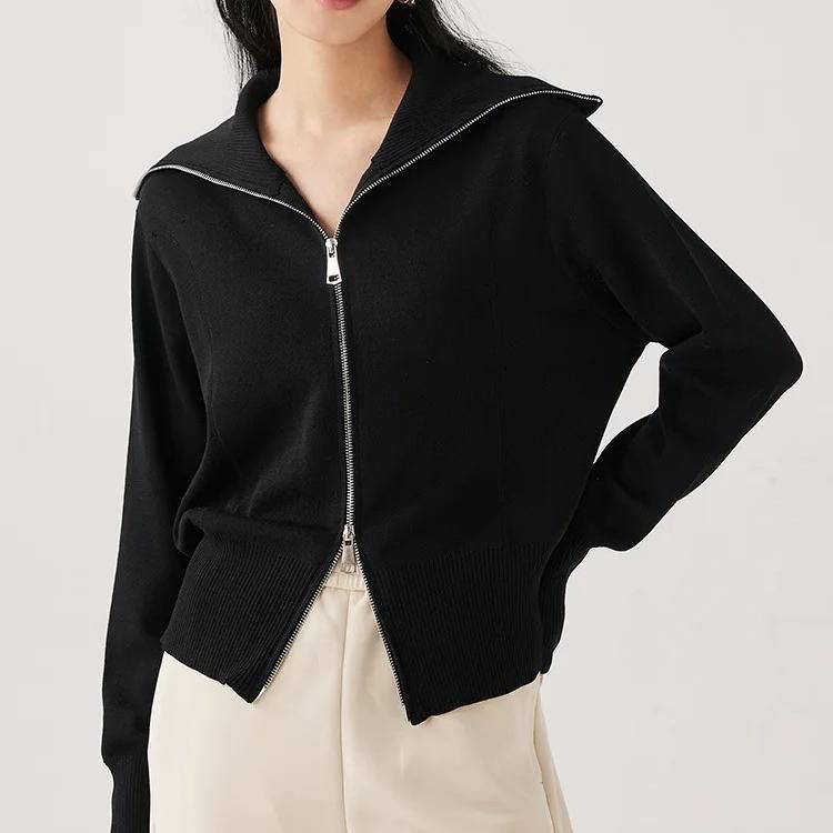 Women's Knitted Patchwork Cardigan with Double Zippers and High Collar