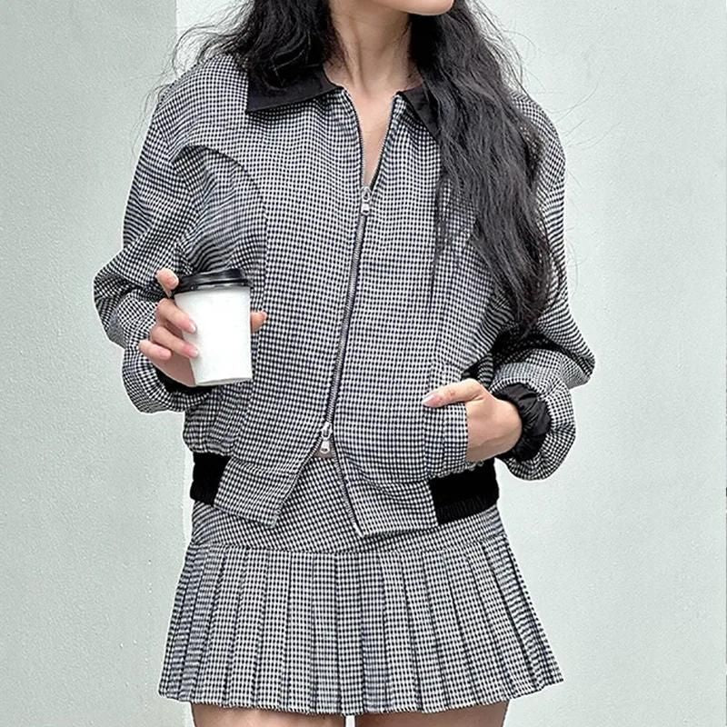 High Waist Pleated Skirt and Houndstooth Cardigan Set