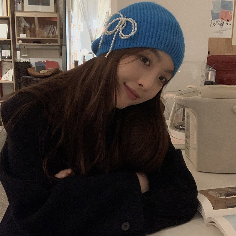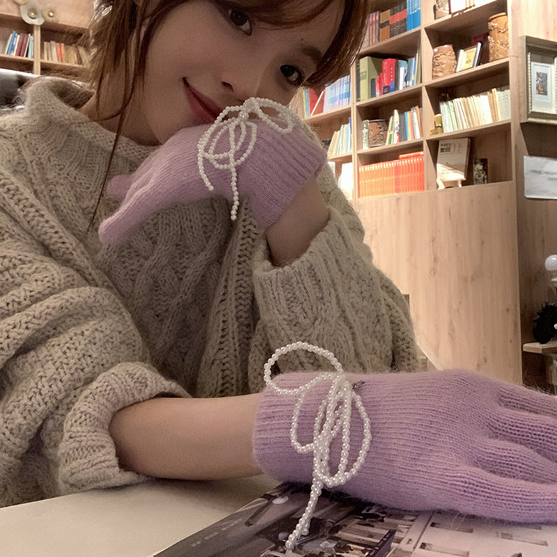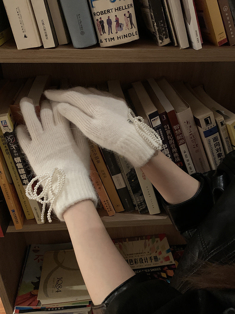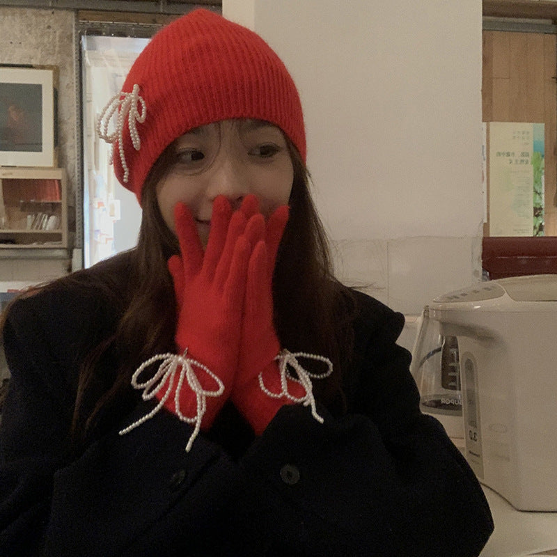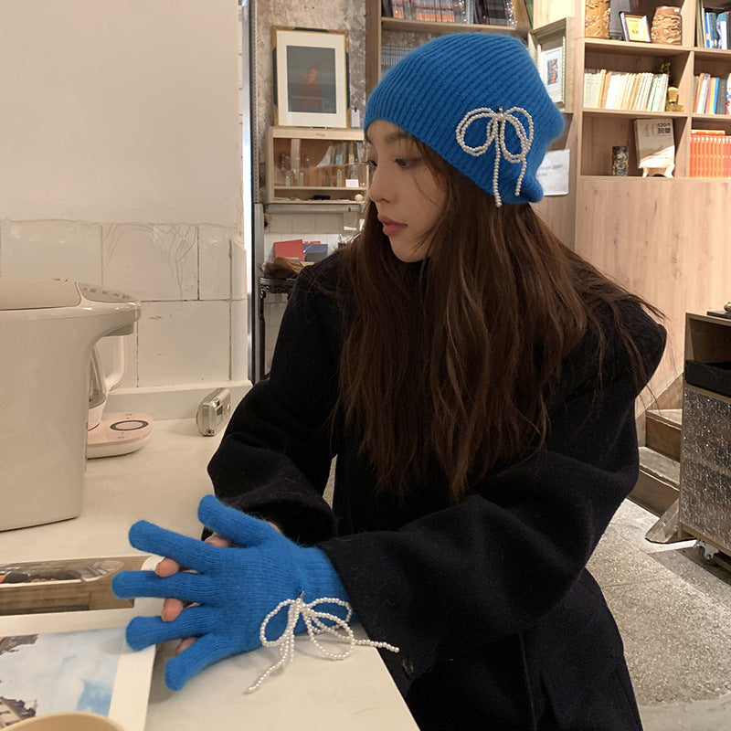 Wool Pearl Bow Finger Gloves Pearl Pendant Hat Macaron Color Rabbit Fur