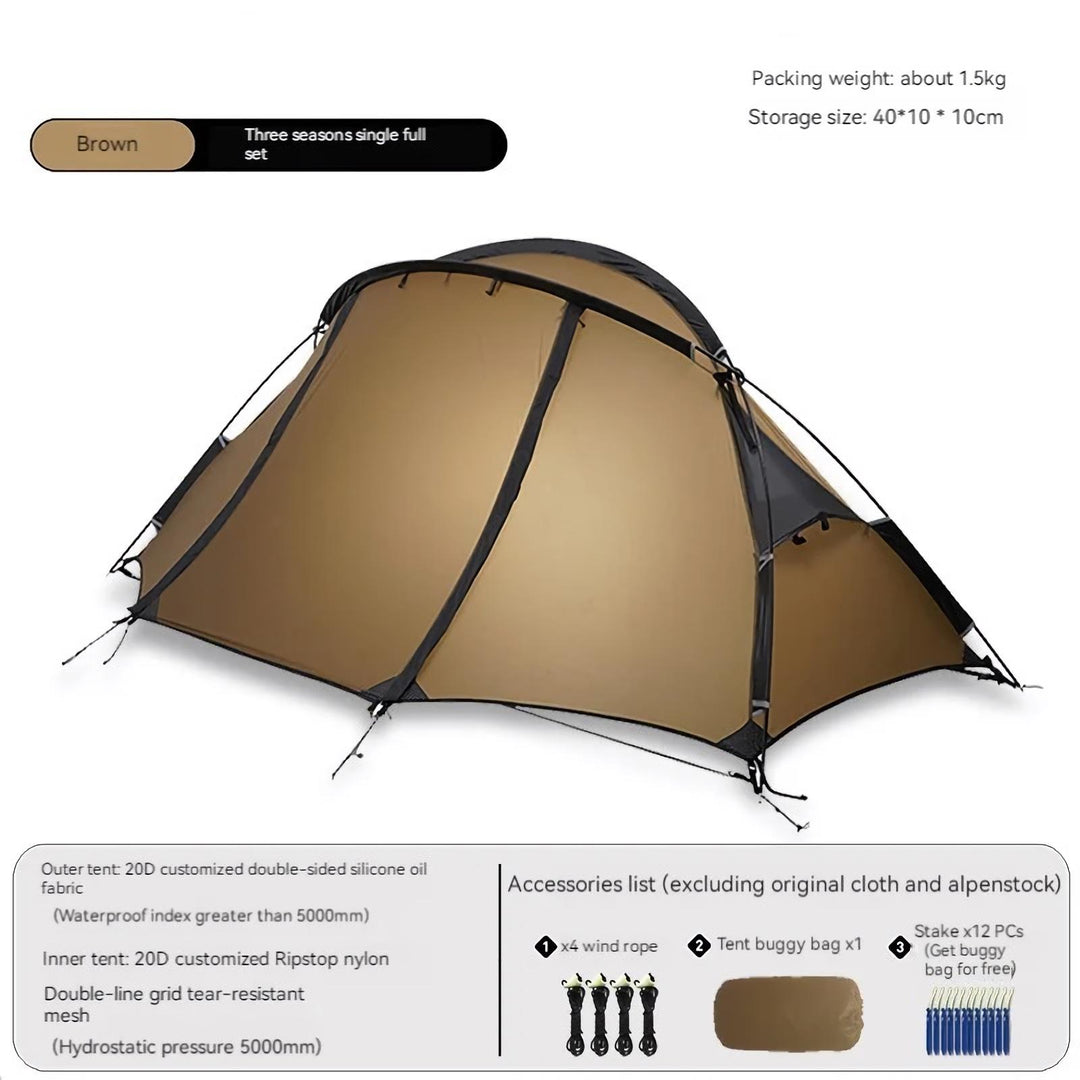 Discover the perfect blend of durability, comfort, and convenience with our Ultra-Lightweight 1-Person Camping Tent. Crafted from high-quality 20D silicone nylon, this tent is designed to withstand the toughest weather conditions while providing a cozy and secure shelter for solo adventurers. Whether you’re trekking through the wilderness or setting up camp at your favorite spot, our windproof and rainproof tent ensures you stay protected and comfortable throughout your journey.