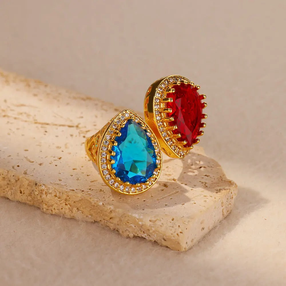 Luxury Water Drop Zircon Rings for Women - Red Blue Cubic Zirconia Stainless Steel Band