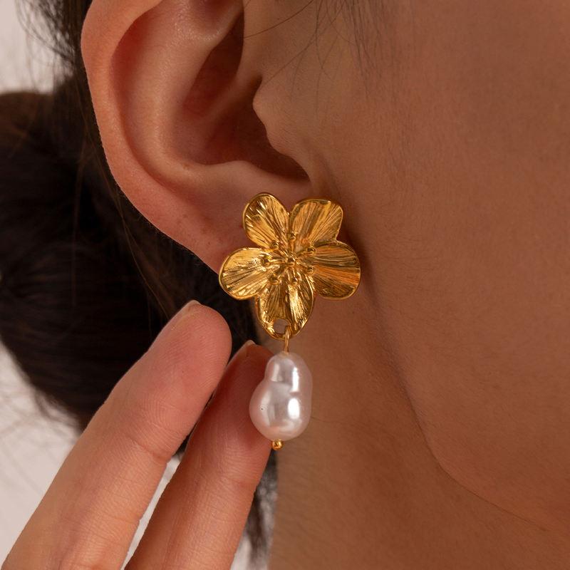 Luxury 18K Gold-Plated Stainless Steel Floral Pearl Drop Earrings