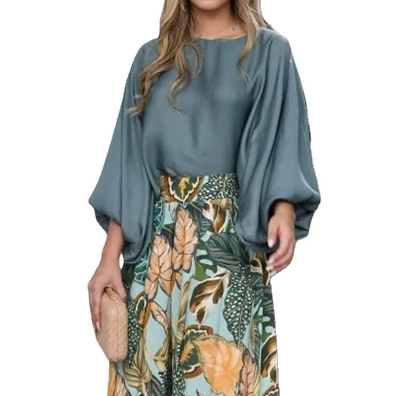 Women's Fashion Lantern Sleeve Printed Top Wide Leg Pants Two-piece Set