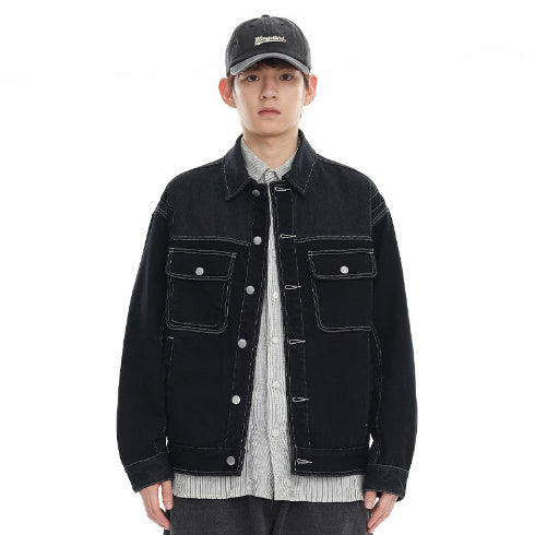 Color Stitching Turnover Neck Denim Coat Men And Women Cityboy Loose Workwear Casual Jacket