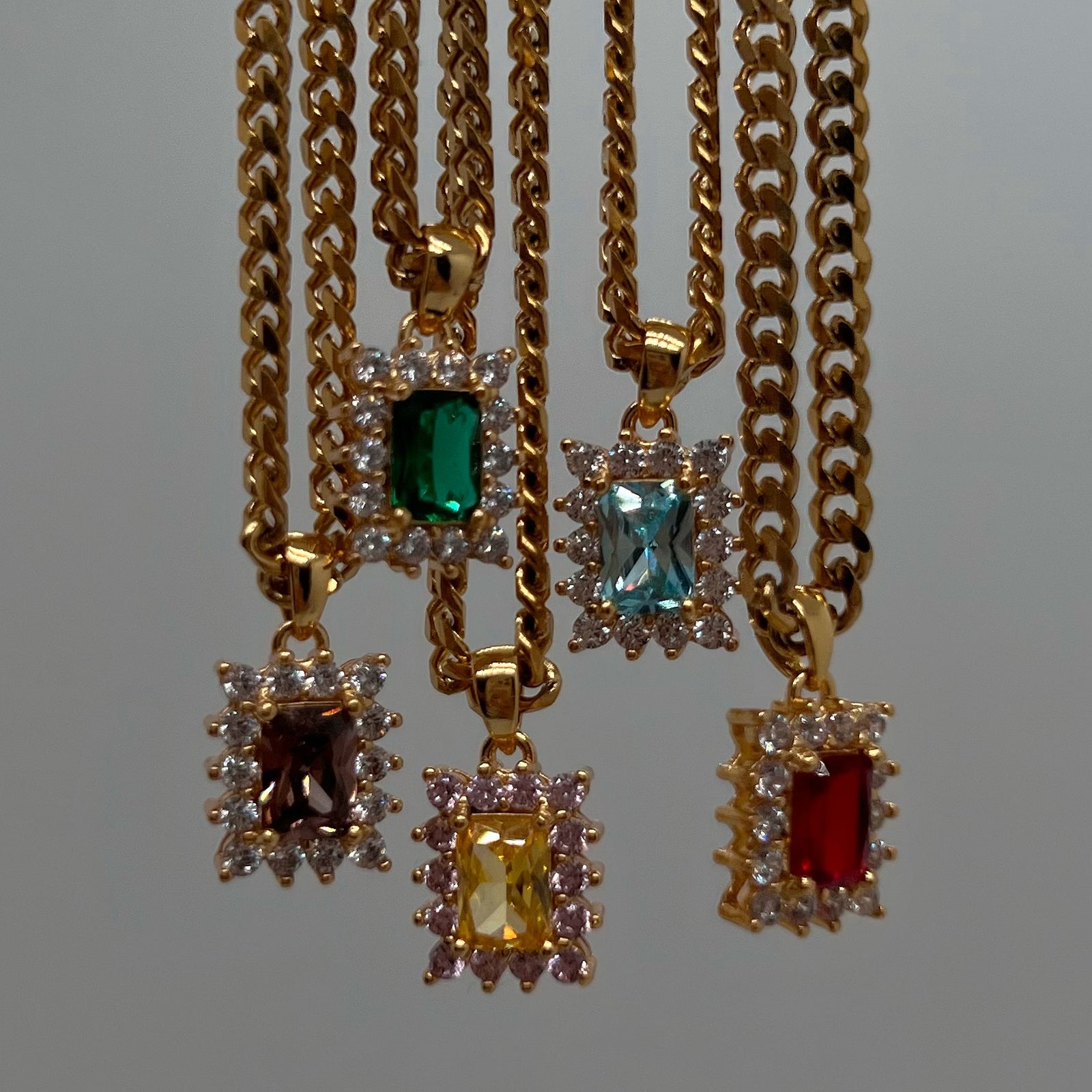 Square Zircon Emerald Navy Blue Titanium Steel Necklace