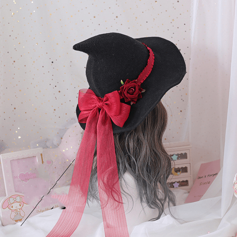 Lolita Halloween Retro Witch Hat Masquerade Rose Big Bow Wizard Hat Gothic Magical Girl Hat Cosplay Accessories Party Decor