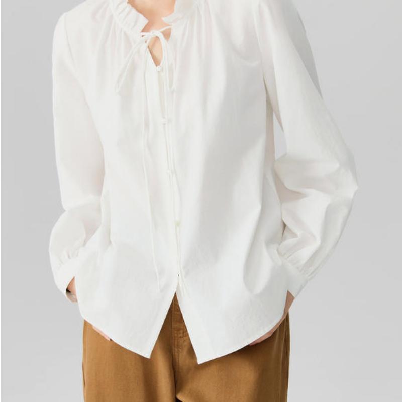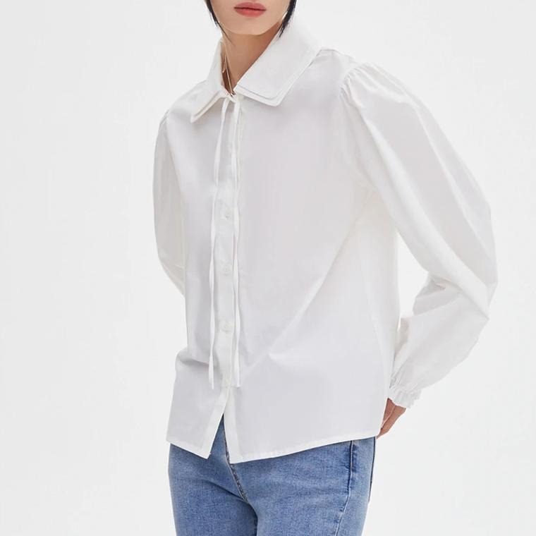 Elegant Egyptian Cotton Long-Sleeved Blouse with Detachable Ribbon