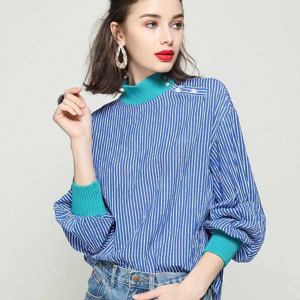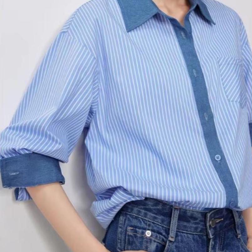 Autumn Striped Patchwork Denim Blouse Shirt