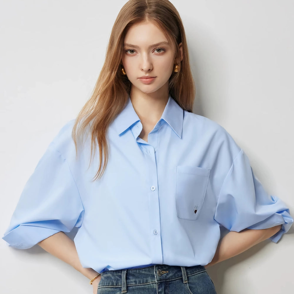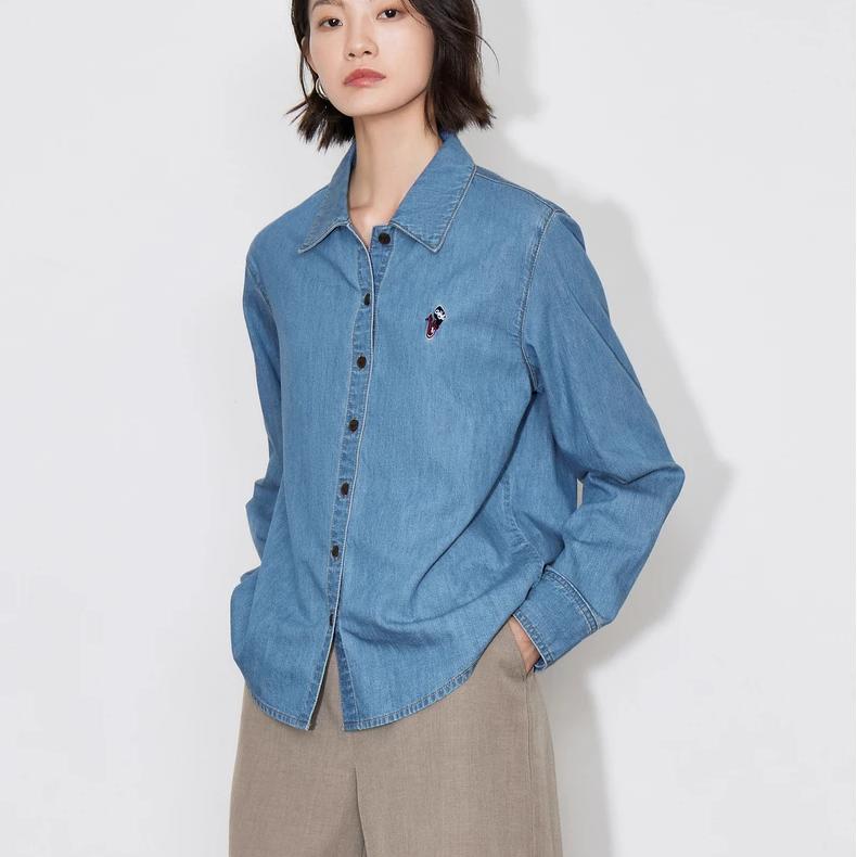 Autumn Embroidered Pure Cotton Polo Collar Denim Shirt