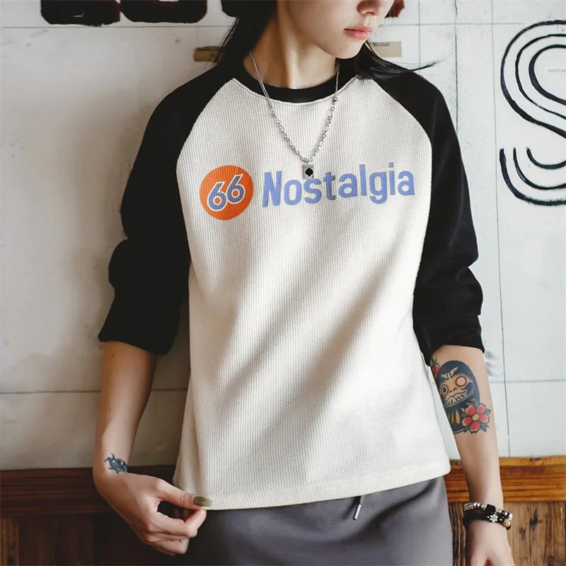Women's Retro Contrast Raglan Sleeve Long Sleeve Waffle Top