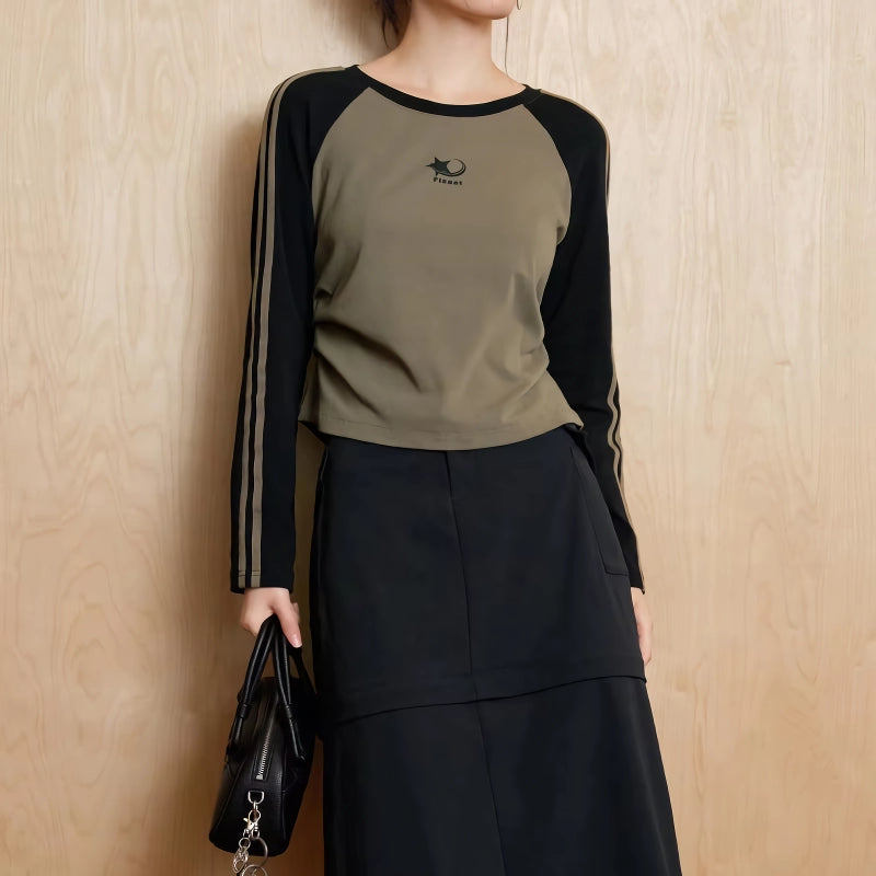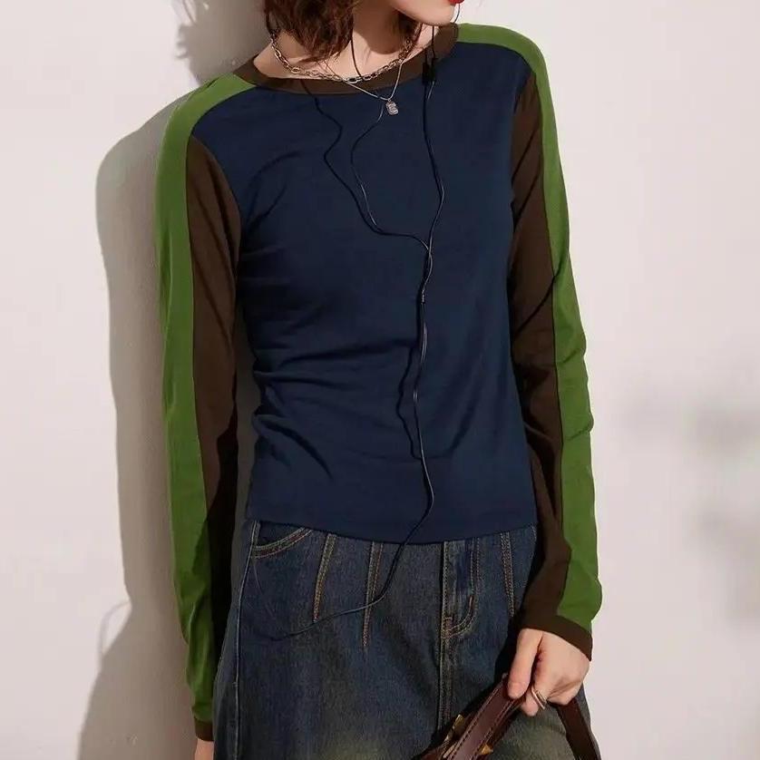 Spring Long Sleeve Casual Round Neck Contrast Color Pullover Top