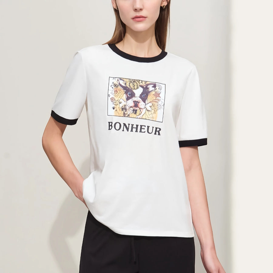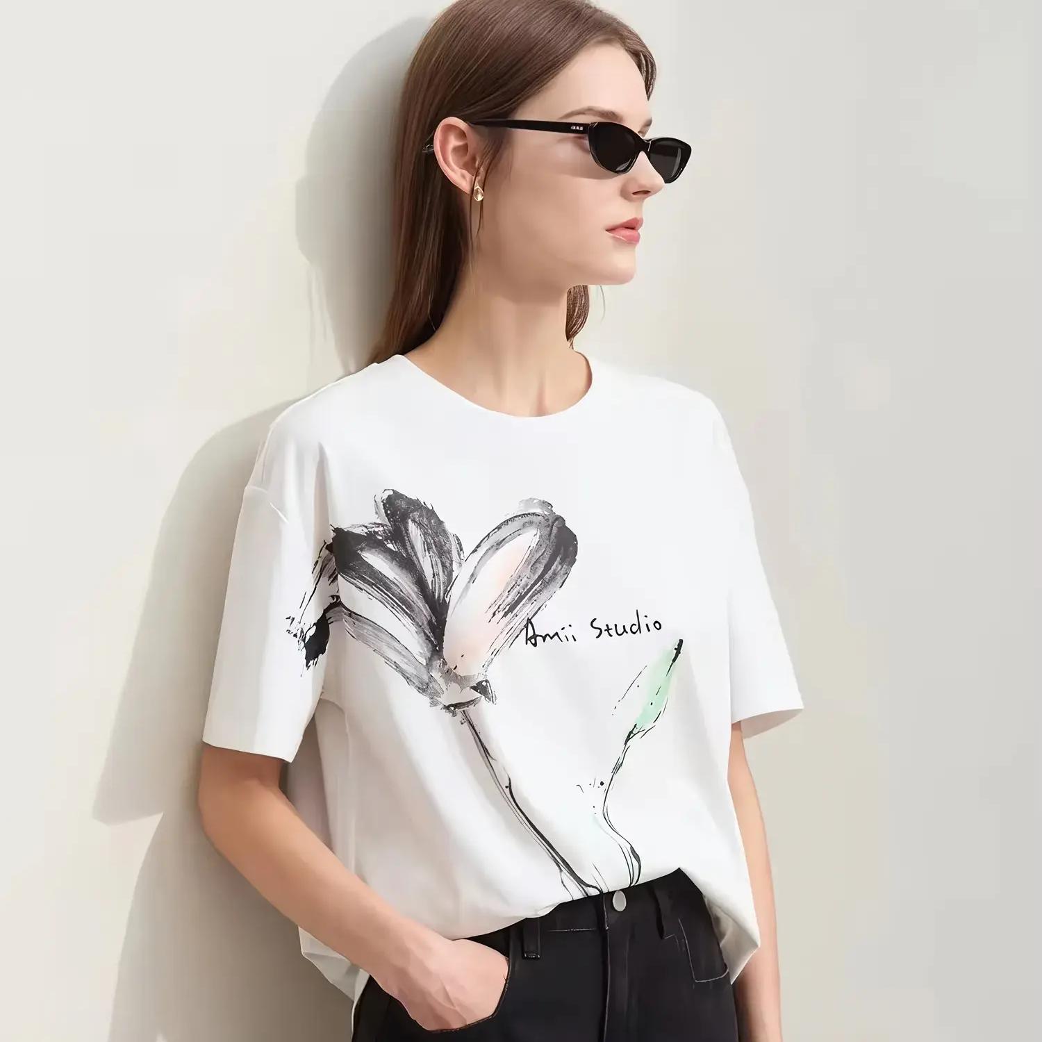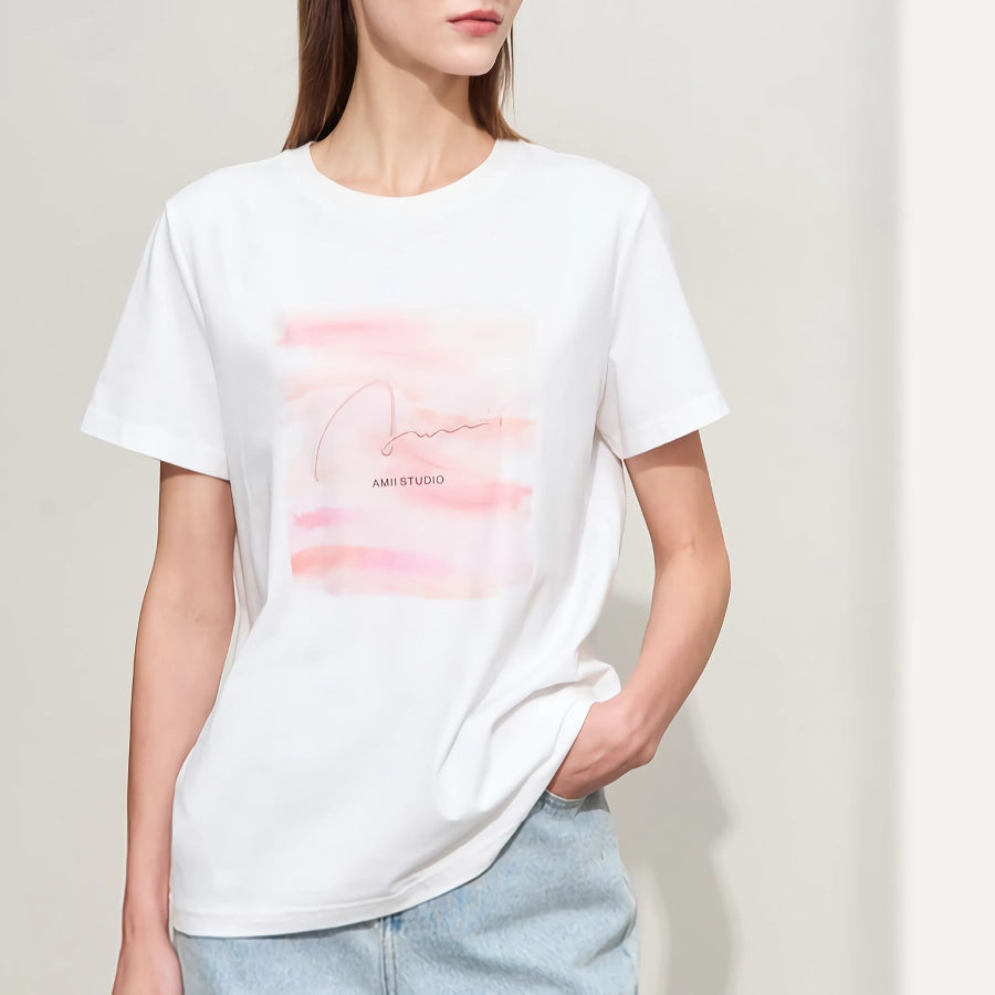 Minimalist Stretch Printed Drop Sleeve Mid-Length T-Shirts for Women