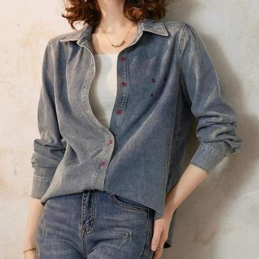 Spring Casual Denim Shirt with Embroidery