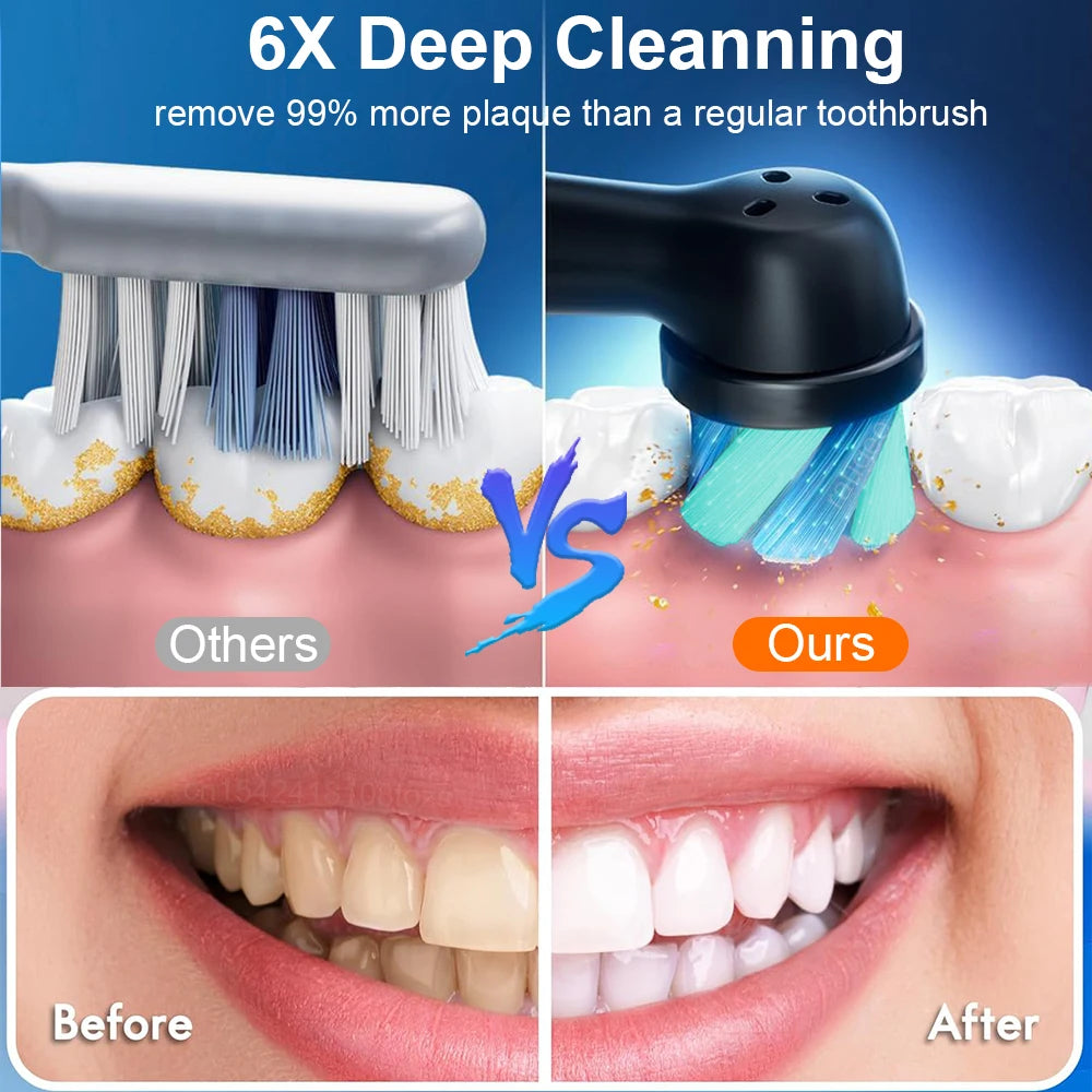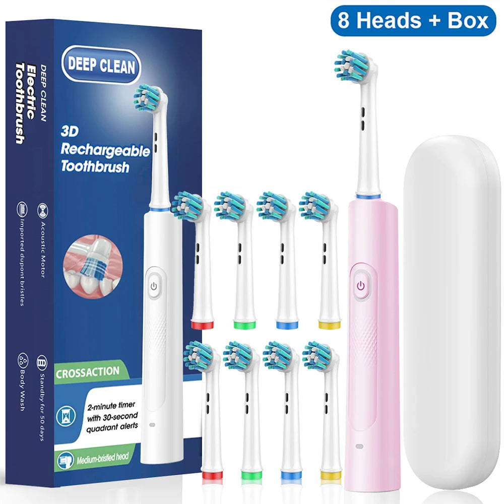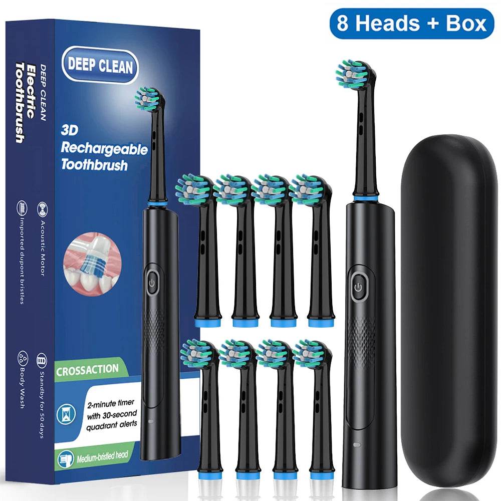 Invest in your oral health with the *Rechargeable Rotating Electric Toothbrush for Adults*. Whether you're at home or traveling, this toothbrush gives you a deeper clean and a more personalized experience. With 8 replacement heads included, it’s a long-lasting, high-quality option for those serious about their dental care. Order yours today and start enjoying a cleaner, healthier smile!