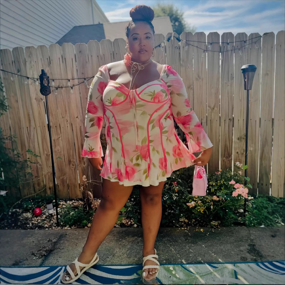 Women's Flared Long Sleeve Tied Lotus Leaf Flower Print Dress